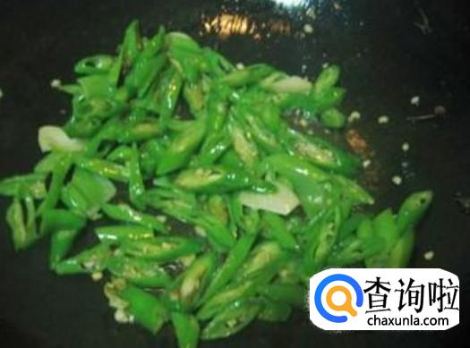 尖椒下锅加适量的盐翻炒至软。