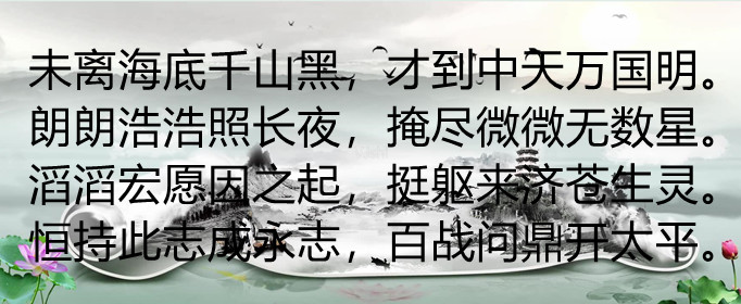 后来明太祖朱元璋剿灭群雄,问鼎中原,一统全国。他也听说了此事,颇有兴趣,大笑说:我来写。于是自己也想尝试赋诗,对一对这流传百年的半诗。经过一番思索、推敲后便对了六句诗予以补齐:“未离海底千山黑 , 才到中天万国明。朗朗浩浩照长夜, 掩尽微微无数星。滔滔宏愿因之起, 挺躯来济苍生灵。恒持此志成永志, 百战问鼎开太平。”此诗又被朱元璋赋名《咏月诗》。
