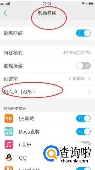 在移动网络窗口中选择下方的【接入点】选项,如下图所示: