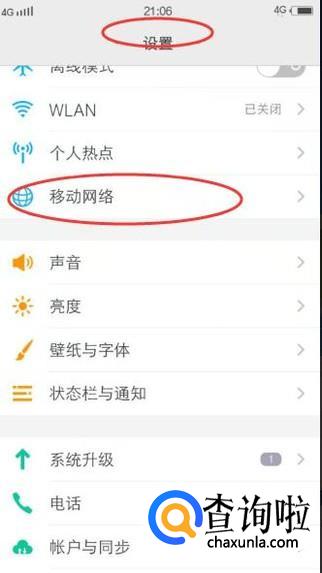 然后在【设置】窗口中选择【移动网络】选项,如下图所示: