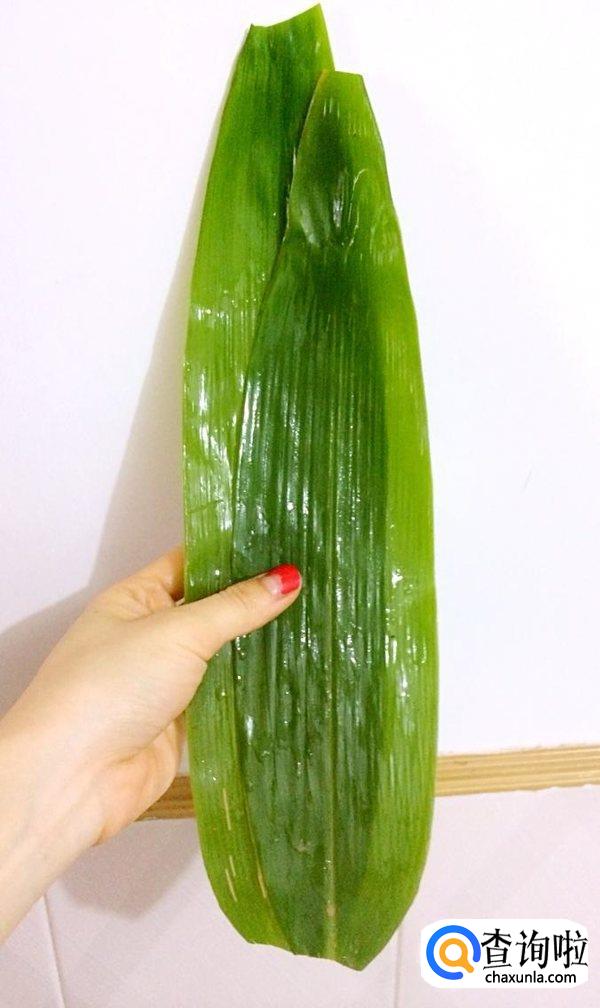 取洗净的粽叶两张,正面向上,一片压住另一片的一半,粽子叶尾向同一个方向。