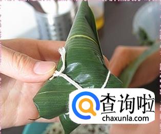 把最前面的粽叶向上折叠,压在刚才折叠的上面。用棉线缠绕几圈,打个结,就可以啦。