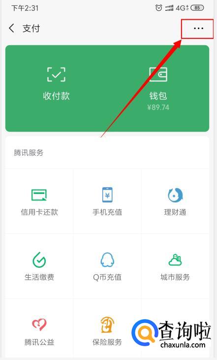 进入个人页面后,点击“支付”进入支付页面,然后点击右上角的三个点。