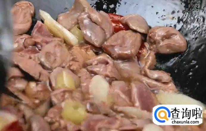 滑入鸡心、鸡肝和鸡胗,加少许黄酒炒至断生。