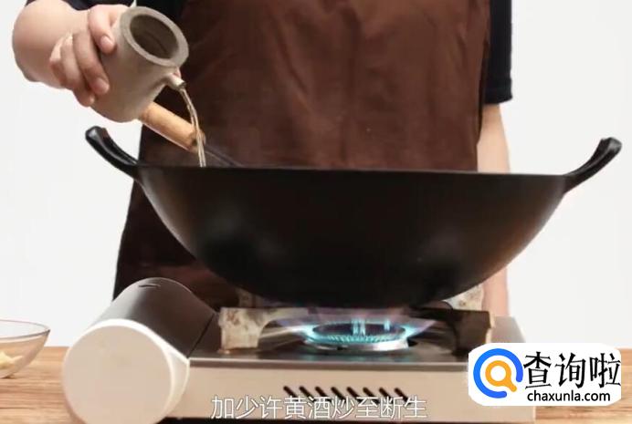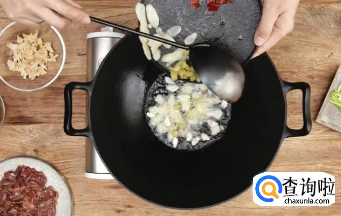 开大火,热锅冷油,放姜片、蒜片煸炒出香味。
