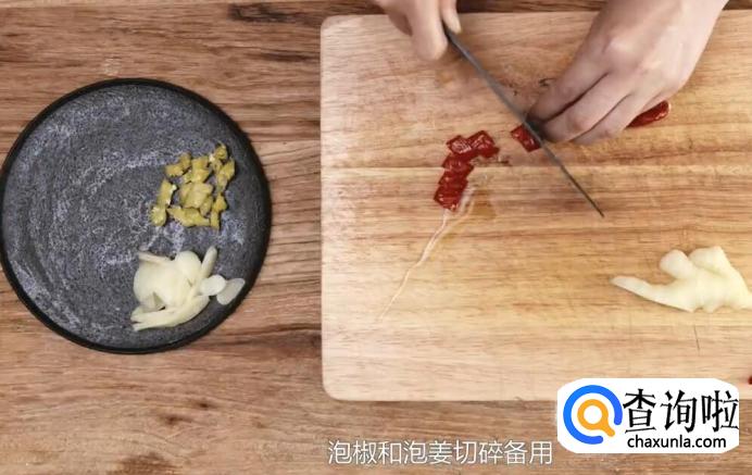 泡椒和泡椒切碎备用。