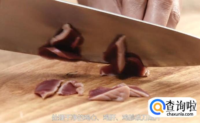 将处理干净的鸡心、鸡肝、鸡胗改刀切片。