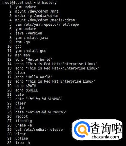 history 命令可以查看执行过的命令,格式为history [-c]。