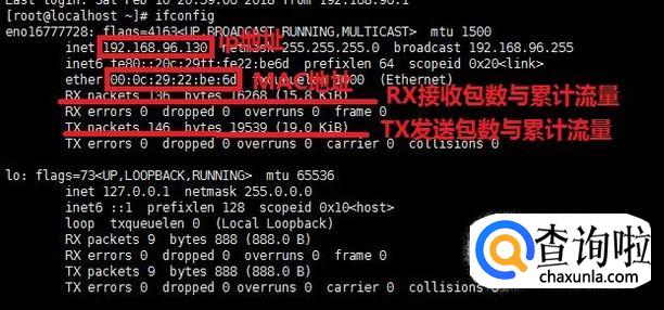 通过该命令主要查看网卡名称、IP地址、MAC地址以及RX、TX的接收数据包与发送数据包个数与累计流量。