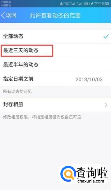 然后我们点击最近三天的动态,这样我们就设置好了。