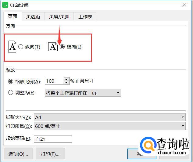 接着,我们再回到‘页面’选项卡,选择‘横向’单选框,缩放比例自己调整即可,点击‘确定’按钮。