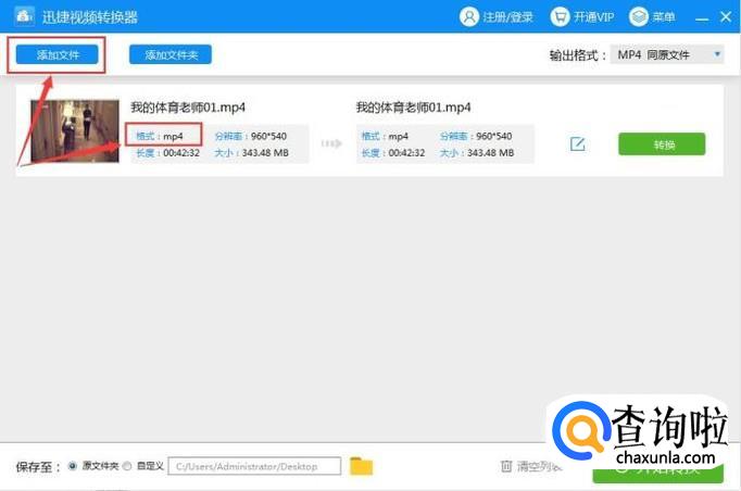 点击软件界面左上角的“添加文件”按钮将需要转换的视频添加到转换器中(这里以MP4文件为例)!