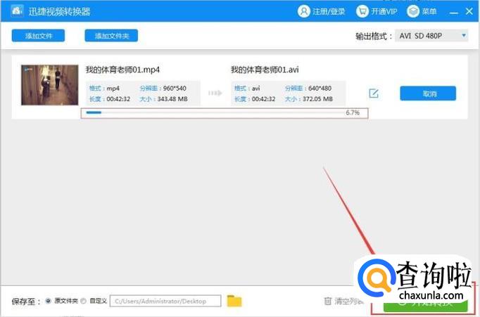 文件添加好了并且转换格式也选择好了之后,最后我们要做的就是转换文件了,点击“开始转换”按钮就可以将添加的MP4文件转换成AVI文件!