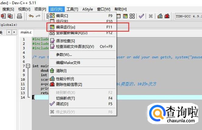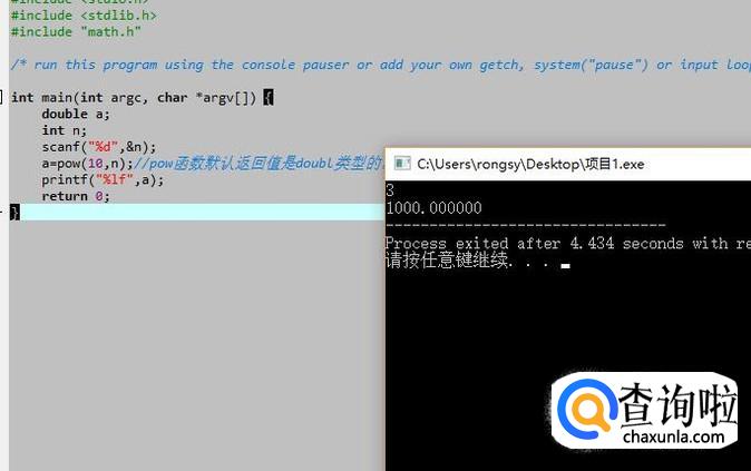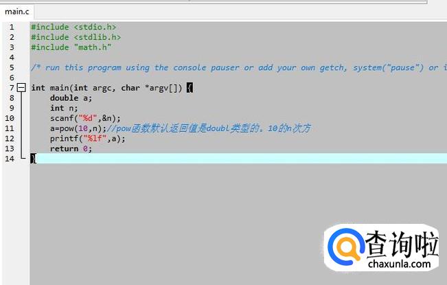接下来在C语言文件中通过pow函数进行十的次方运算,如下图所示