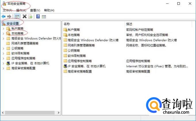如图所示,唤出"本地安全策略"程序窗口。展开左侧树形目录结构,点击"安全设置→本地策略"文件夹。