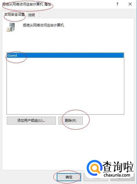 如图所示,弹出"拒绝从网络访问这台计算机 属性"对话框。选择"本地安全设置→Guest"账户,点击"删除"按钮。