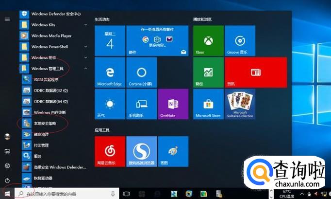 启动Windows 10操作系统,如图所示。拖动右侧垂直滚动条,选择"Windows 管理工具→本地安全策略"项。