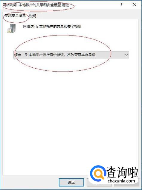 如图所示,弹出"网络访问:本地账户的共享和安全模型 属性"对话框。点击"本地安全设置"文本框向下箭头,选择"经典-对本地用户进行身份验证,不改变其本来身份"项。