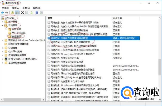选择"本地策略→安全选项"文件夹,如图所示。拖动右侧垂直滚动条,鼠标双击"网络访问:本地账户的共享和安全模型"项。