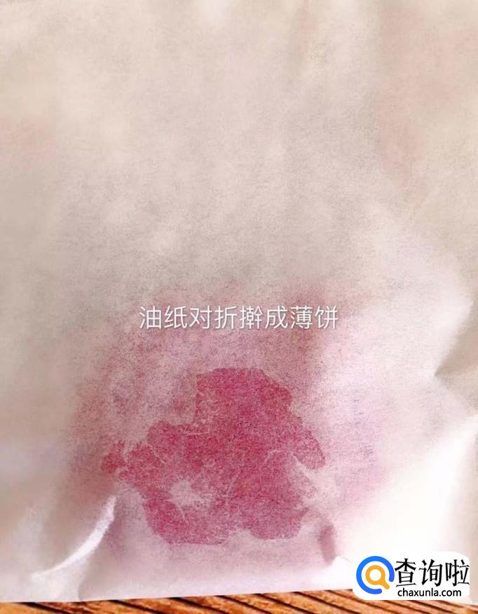 然后把面团放入油纸对折,擀成薄饼,如下图所示。