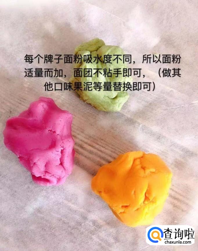 大家在和面团的过程当中,如果感觉比较湿,可以适量加入一些面粉。小贴士:1.关于面粉的加入量,大家可以根据实际情况而定。2.绿色面团用菠菜汁,黄色面团用芒果汁。