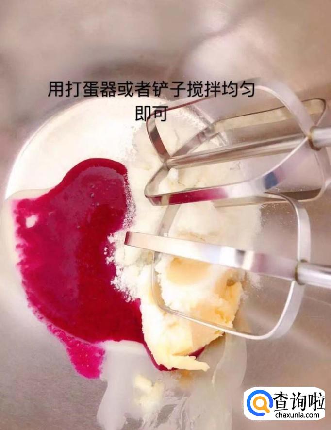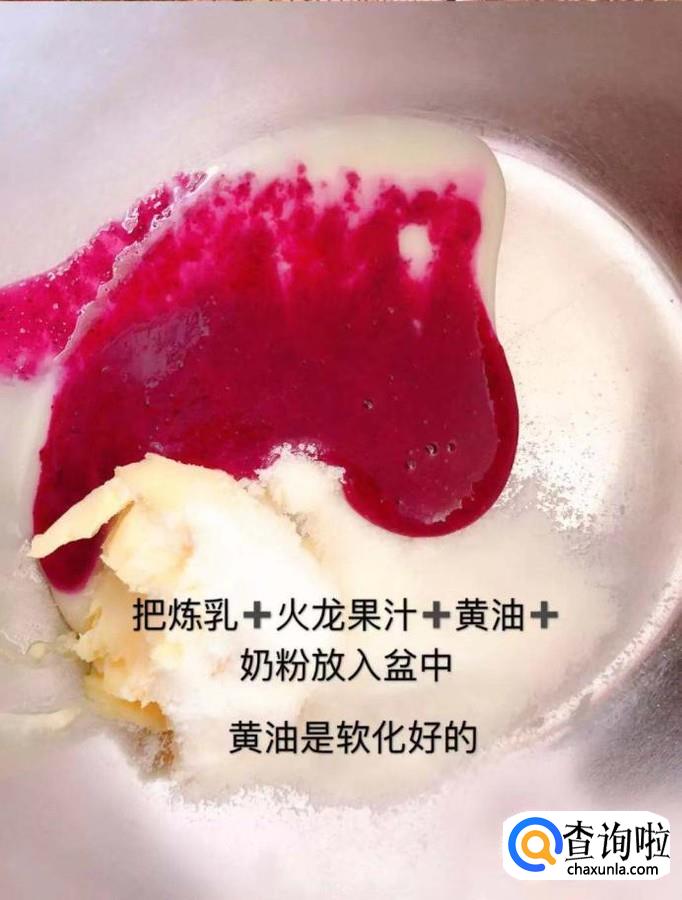 然后把炼乳、火龙果汁、黄油和奶粉一起倒入盆中,如下图所示。