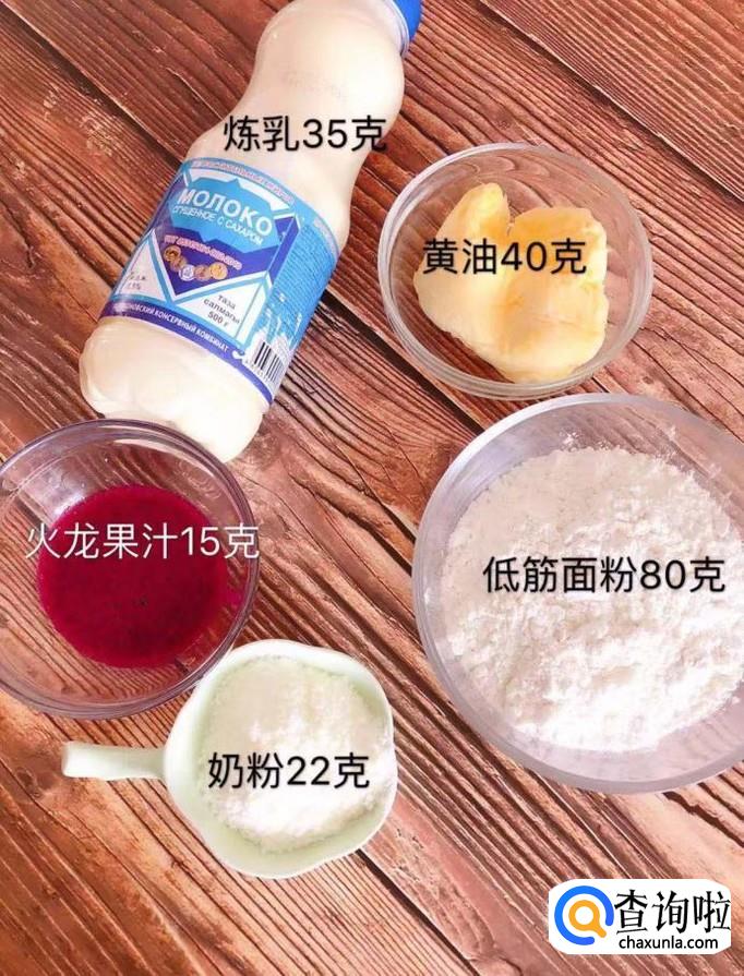 首先准备好所有的食材,如下图所示。小贴士:炼乳35克,火龙果汁15克,奶粉22g,低筋面粉80克,黄油40克。