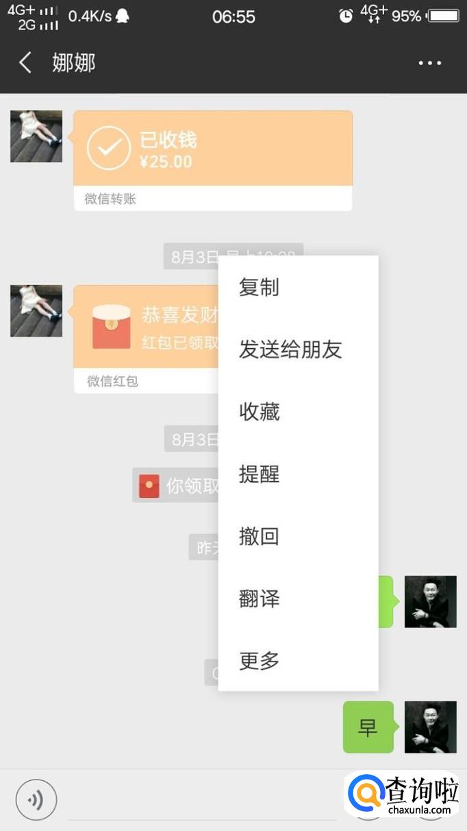 然后,我们随意的给她发送一条消息,发送过后长按那条消息,点击撤回。