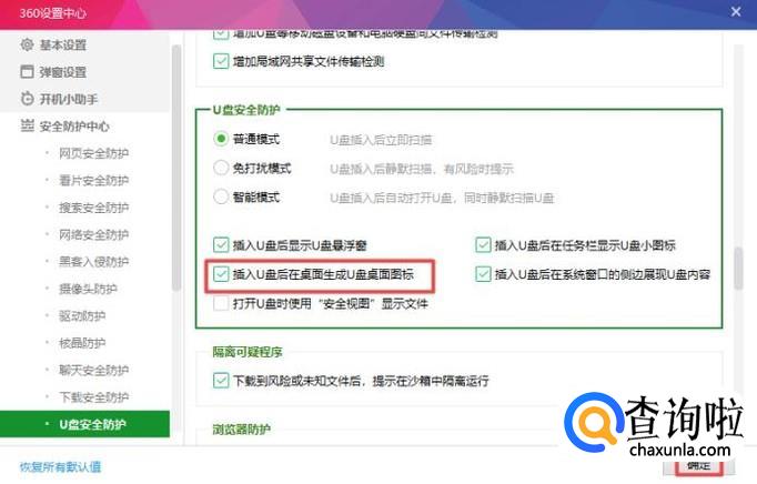 之后我们点击勾选上插入U盘后在桌面生成U盘桌面图标,最后我们点击确定就可以了 。