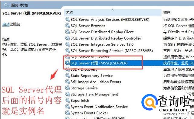 然后在服务界面找到sql server代理服务,如下图所示,它后面括号里的内容就是sql server的实例名