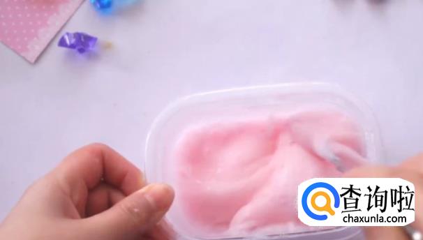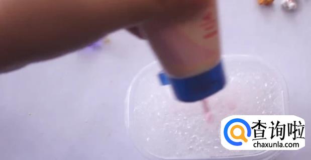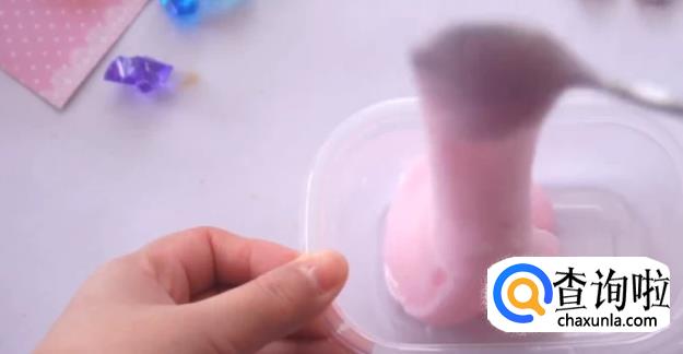 加入小半盒的胶水,并挤入一些护手霜,用勺子混合均匀。因为护手霜是粉红色的,所以这里我们就不用再额外添加颜色了。