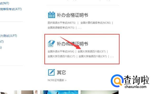 进入首页后将页面向下滑动,在页面的右下方找到“补办成绩证明书”,并在下方找到“全国大学英语四六级(CET)”,点击进入。