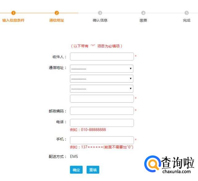 因为证书重新印制后是一快点的方式送到补办人手中,故需要填写收件地址及收件人信息,务必填写真实信息,否则可能不能成功收到证书,填写完成后点击确定。