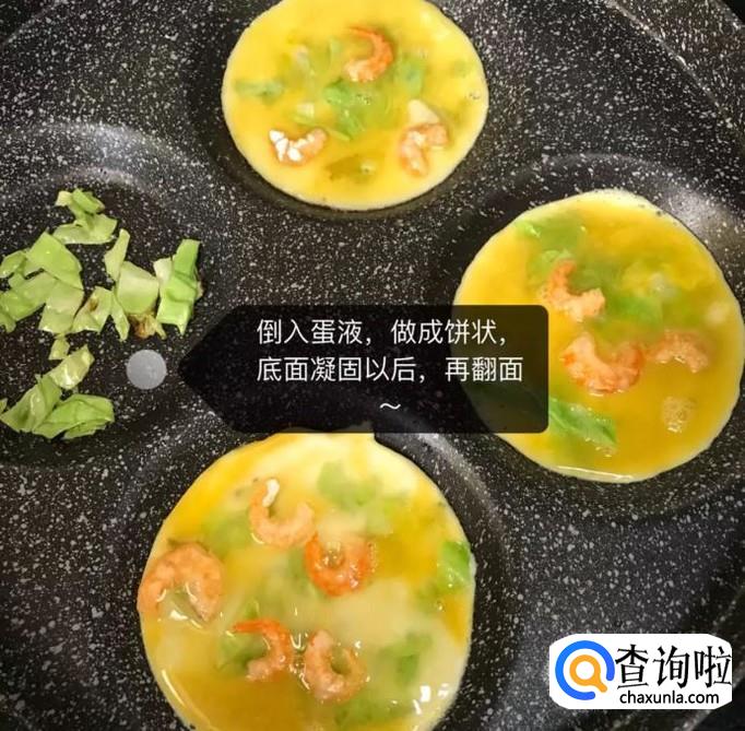 然后倒入蛋液,做成饼的形状,之后等到底部凝固以后再翻个面,如下图所示。