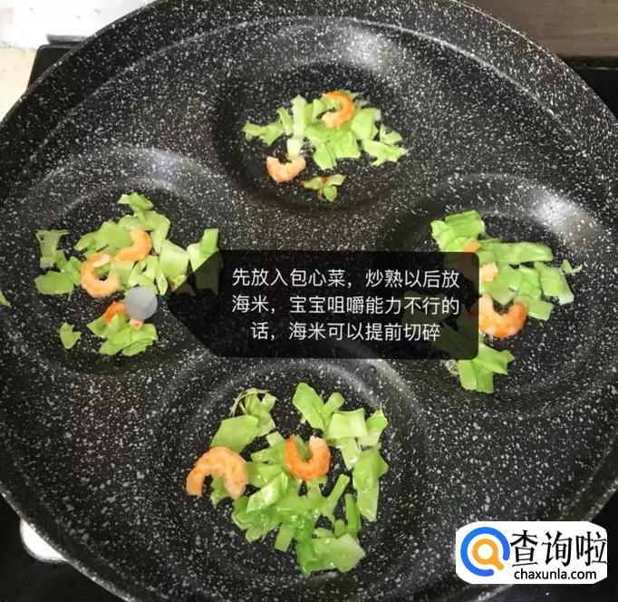 接着把包心菜放进去炒熟以后放上海米,如下图所示。