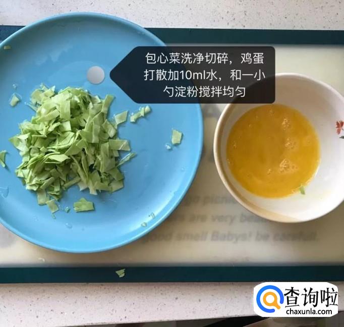 接着将包心菜洗干净切碎,鸡蛋加十毫升的水和一小勺的淀粉搅拌均匀,如下图所示。