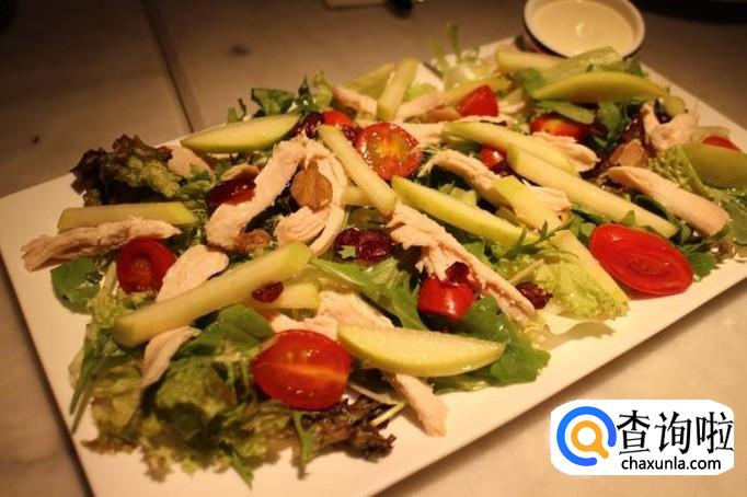 青苹果鸡肉沙拉,青苹果洗干净去皮去核切小颗,泡入盐水中,圣女果对半切开,鸡胸肉放入煮开的水,加盐和少许料酒煮熟,撕成丝,青瓜洗干净切小块,把鸡肉,青苹果,圣女果,青瓜一起放入盘子中,加入沙拉酱即可
