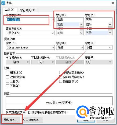 进入之后,在图示位置可以对默认字体格式和大小进行设置,然后点击“默认”即可完成设置。