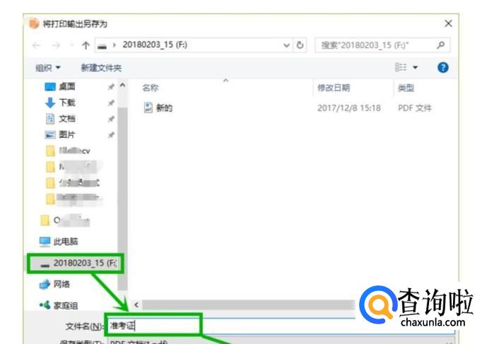 最后,在打开的另存为界面左侧选中U盘,再在文件名后面输入文件的名字,如“准考证”,然后点击保存,这样就可以去打印店直接用U盘打印文件了。