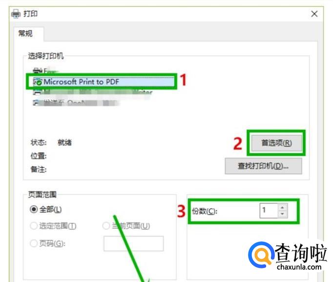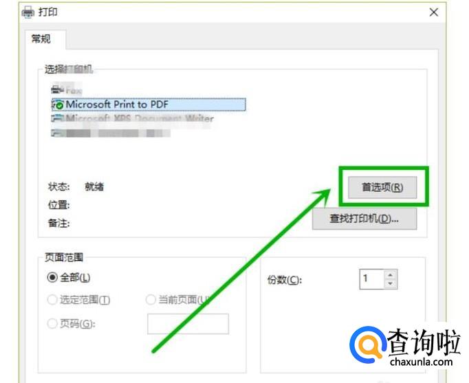 其次,在打开打印窗口,并在选择打印机下面,选择Microsoft print to PDF,当我们需要横向或者纵向打印时,我们就可在这个页面上点击“首选项”按钮设置操作就可以了,选择完再点击“确定”按钮。