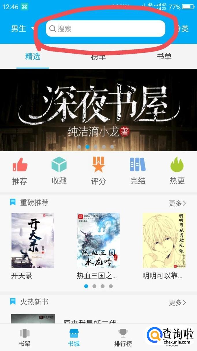 登陆完成后,在下边找“书城”,然后最上边有搜索框,在里边输入自己想看的小说,点搜索就可以了。