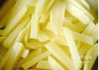 将买回来的土豆去皮洗净,切成小条状的,买的时候尽量选大土豆,这样切出来的土豆条又长又均匀。