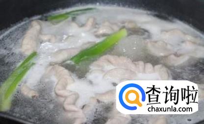 锅装适量的水,放洗干净的肥肠进去,然后加入八角、姜片、香葱进去煮沸后把肥肠灼至八成熟捞上来。