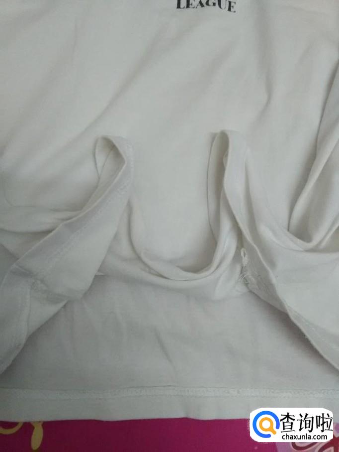 用手从白T恤的前片下摆处揪起两个尖。