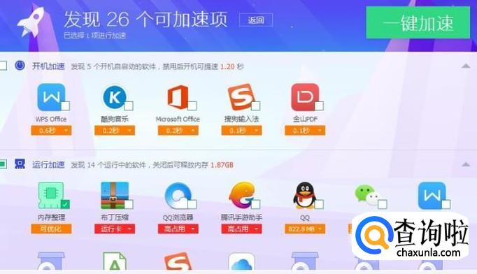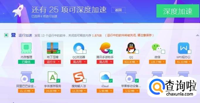 如果通过以上操作,你的电脑还是非常卡,小编建议大家勾选一些占用内存比较大的软件并点击深度加速。