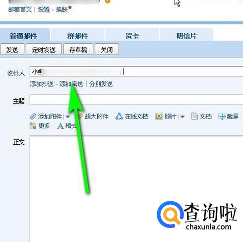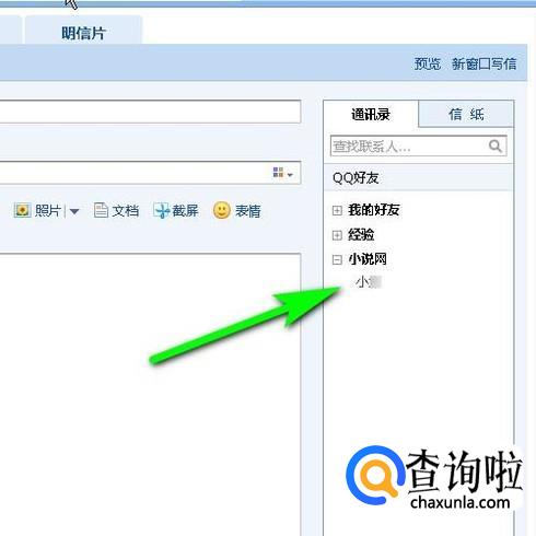 转到编辑普通邮件的个界面。鼠标定位在收件人这里,再从通讯录这里,选择好友