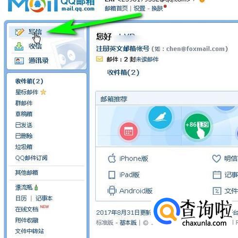 打开了QQ邮箱界面。在左上方这里,点击:写信,如图所示。