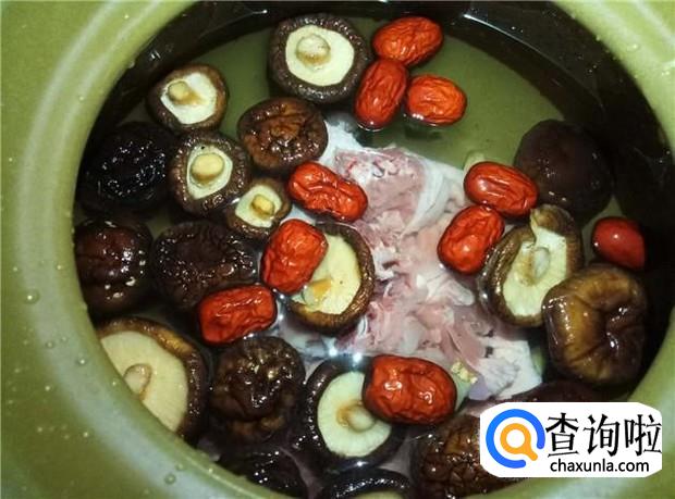 把鸡肉、泡软的蘑菇、红枣、姜片一起放入锅中,加入适量的水,大火煮开。