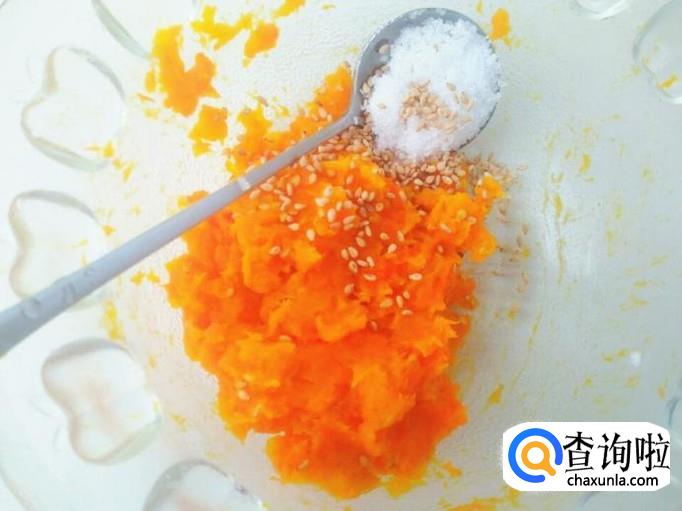 南瓜用勺子挖出来,南瓜皮不要了,胡萝卜放进去,用勺子压碎,加上适当白糖和熟芝麻,这儿特意告诉大家一下,可以放进去一个煮熟的鸡蛋黄,但如果宝宝对鸡蛋过敏的话就不要加了,全部压碎,然后搅拌均匀。