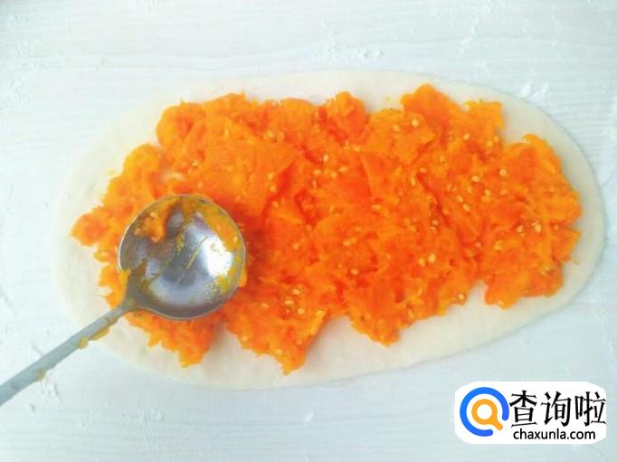 将胡萝卜南瓜芝麻馅倒在面片上,用勺子铺平,面片周边留出一点点空隙不要放,不然这些馅会弄的到处都是。